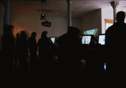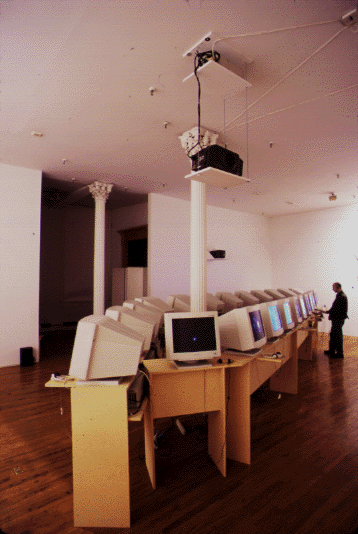 The projects were displayed individually, one-per-monitor, on 25 screens with more works stored and available for viewing on additional computer(s).